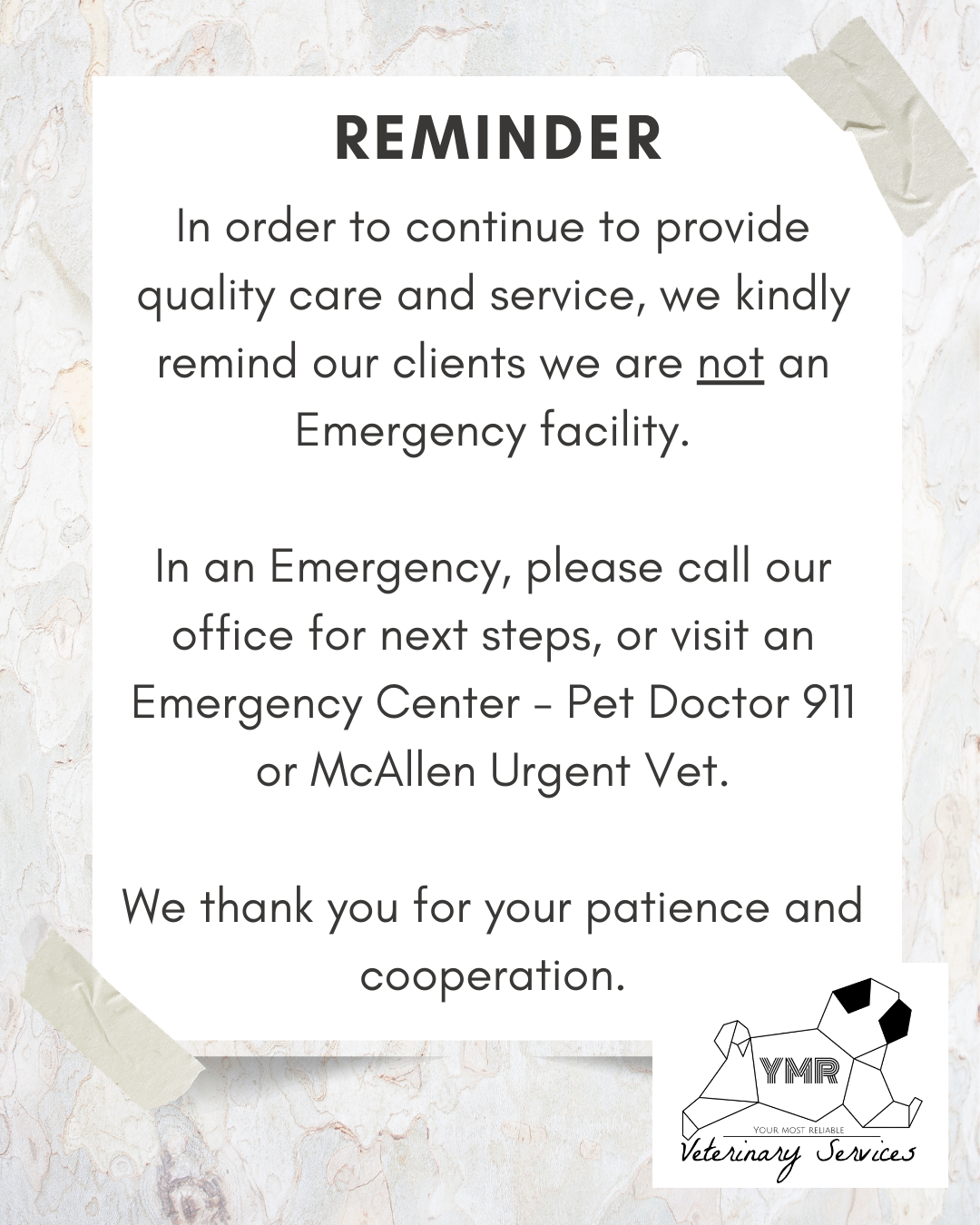 SATURDAYS our customers asked, we delivered!now open every first and last saturday of the month.call for an appointment or book online! NEW CLIENTS stop by to shop our ymr store & enjoy complimentary coffee and snacks.Call for an appointment or book online! existing CLIENTS Manage your pets’ healthcare from the comfort of your home with just a few clicks! Visit pet portal here Discover everything your furry friend needs on our online store!From tasty treats to toys and essential medications, we’ve got it all covered. online pharmacy Visit Online Pharmacy here stay tuned on our social media Instagram Facebook tiktok